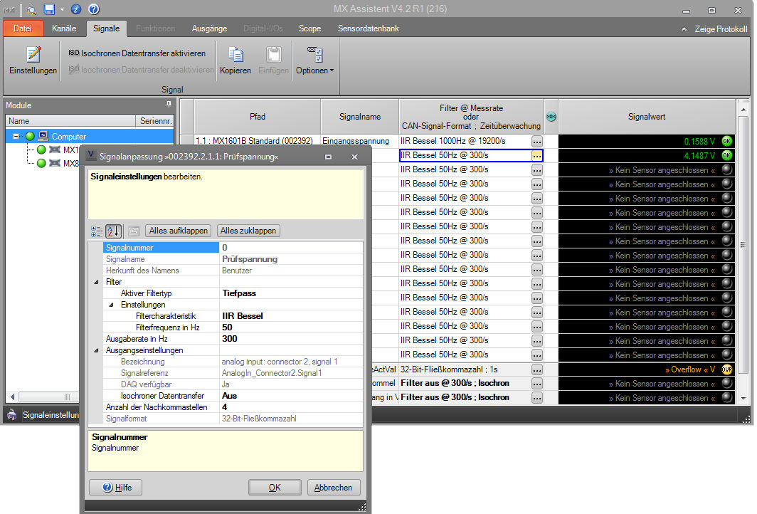 Kanalnamen, Abtastraten und Filtereinstellungen stellen Sie auf der Registerkarte Signale" ein:
