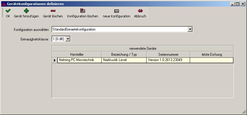Im Dialog Gerätekonfigurationen definieren können Sie in der Combobox 'Konfiguration auswählen' eine der bereits definierten Konfigurationen auswählen. Die zu dieser Konfiguration gehörigen Geräte werden in der Tabelle angezeigt. Sie können ein neues Gerät hinzufügen, indem Sie den Button 'Gerät hinzufügen' anklicken. In der Tabelle erscheint dann eine neue Zeile, in die Sie die Eintragungen für den Hersteller, die Bezeichnung und die Seriennummer vornehmen können. Die Angaben für bereits definierte Geräte können geändert werden, wenn Sie in das entsprechende Feld klicken. Die Angaben zu NeAkustik können nicht geändert werden.