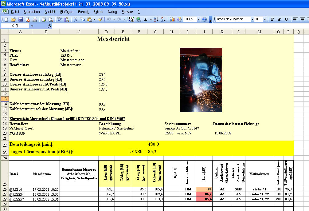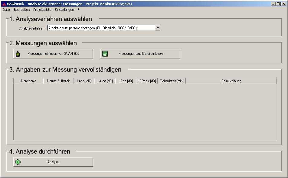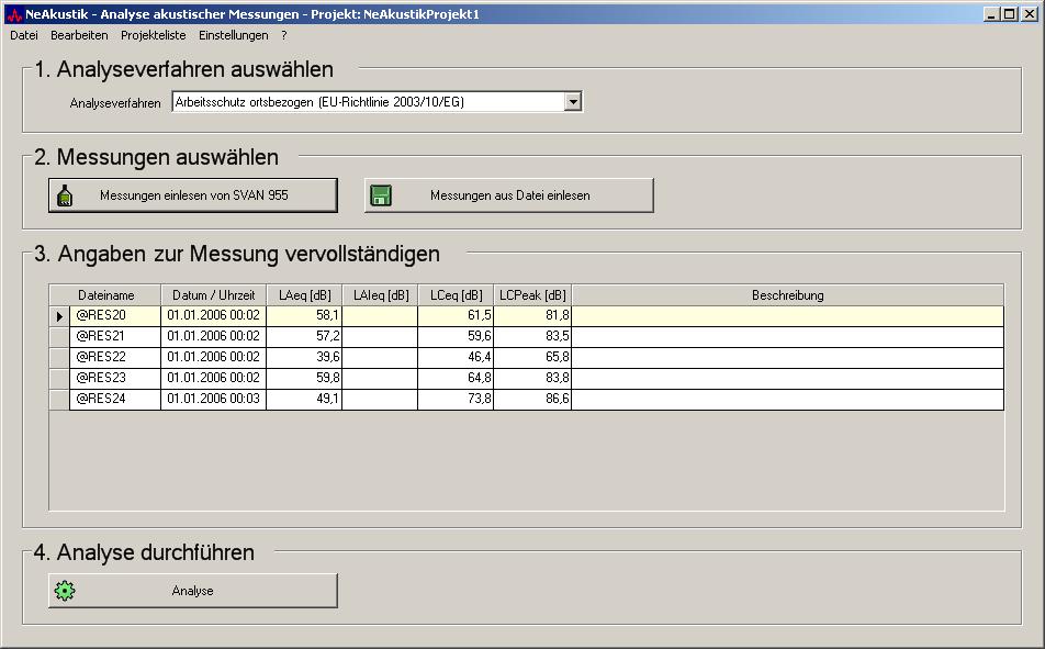 Vervollständigen Sie die Angaben zur Messung in der Tabelle (je nach ausgewähltem Analyseverfahren zum Beispiel bei Arbeitsschutz personenbezogen: Teilwirkzeit, sowie Beschreibung der Messungen, z. B. Messort)