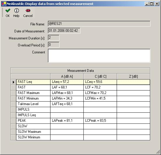 If you click the window "Read measurement from file" or if you click in the main window in the grey field on the left beside the file name in the table the measurement-info dialogue will appear displaying all results of the measurement.