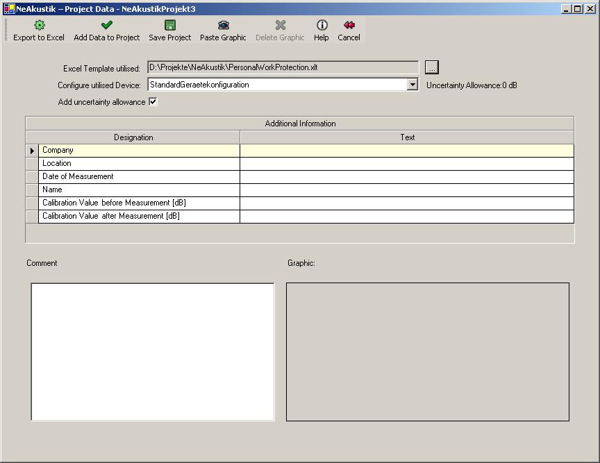 Graphics that were inserted during the evaluation can be added to a project. For this purpose click the button "Insert Graphic" and select the relevant graphic. The selected graphic will be displayed in the corresponding frame. The graphic can later be deleted from the project by clicking on the button "Delete Graphic." If no graphic is designated for the selected Excel Template than this will be displayed in the upper part of the graphic.