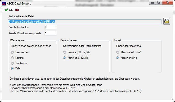 NeVib kann Messungen mit einem oder zwei dreiachsigen Vibrationsmesspunkten auswerten. Wenn die ASCII-Datei die Daten von einem Vibrationsmesspunkt enthält, geben Sie hier eine 1 ein, wenn sie die Daten von zwei Vibrationsmesspunkten enthält, eine 2.