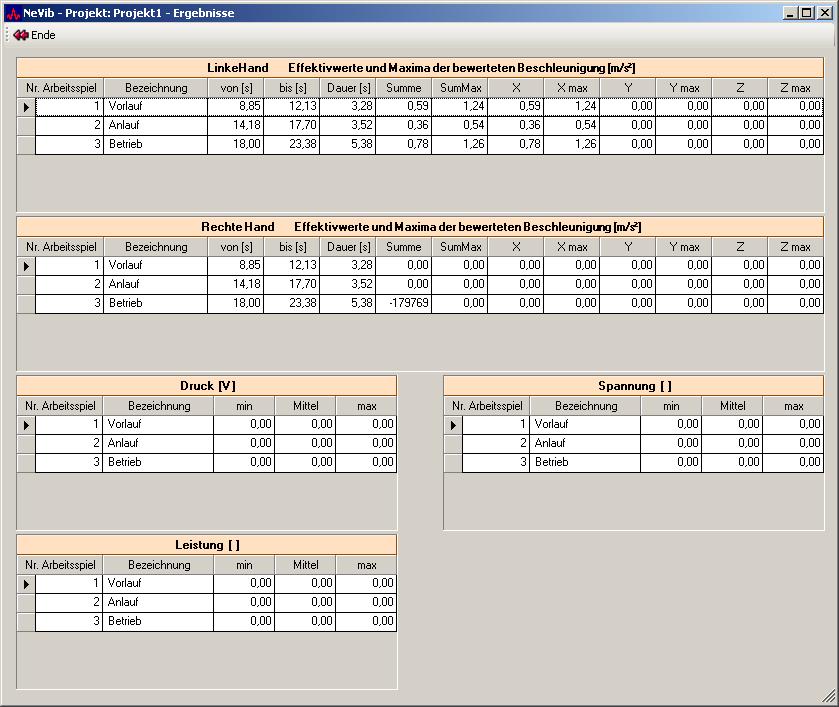 Gewichteter Intervall-Effektivwert der bewerteten Beschleunigung (Bewertung Hand-Armschwingung nach EN ISO 8041) in X-, Y- und Z-Richtung.