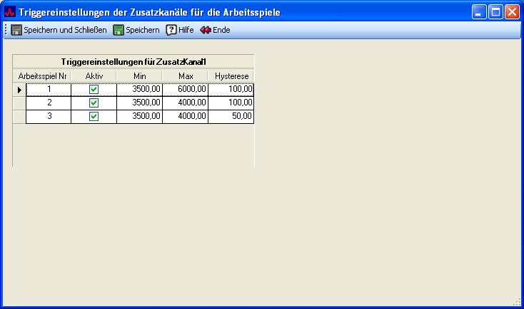 Sie können Triggereinstellungen definieren, um bestimmte Vibrations-Messwerte aus der gesamten Messung herauszufiltern. Diese Einstellungen können Sie für jedes Arbeitsspiel einzeln setzen. Wenn z. B. ein Zusatzparameter die Drehzahl ist, dann werden für den Leerlauf und unter Last sicher andere Grenzwerte sinnvoll sein. Die Einstellungen für nicht vorhandene Arbeitsspiele werden ausgeblendet.