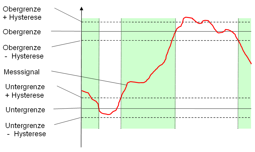 Wenn Sie zum Beispiel an einem Prüfling messen, dessen Drehzahl sich bei unterschiedlicher Last verändert und Sie sich nur für Messwerte in einem bestimmten Drehzahlbereich interessieren, können Sie eine Ober- und eine Untergrenze einstellen. Damit die Ein- und Ausschaltvorgänge eindeutig sind, kann zusätzlich eine Hysterese eingestellt werden.
