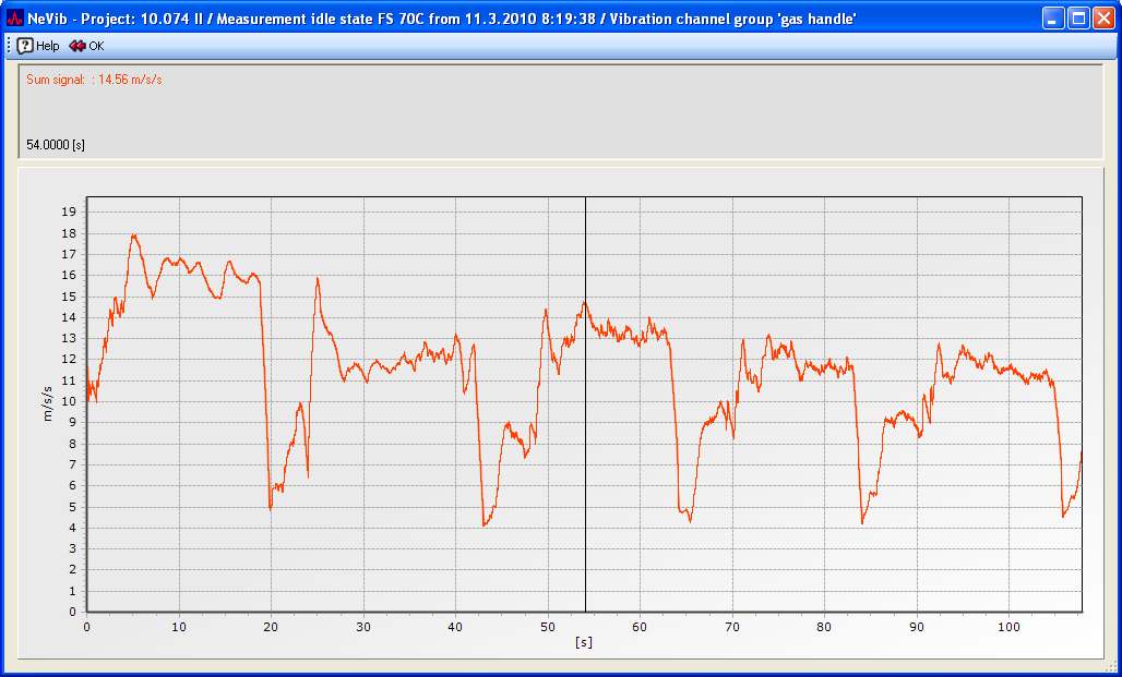 For the vibration channel groups the display selected in the working cycle dialog will be displayed (unweighted acceleration signals / mean RMS for 1 s / single view / sum view.