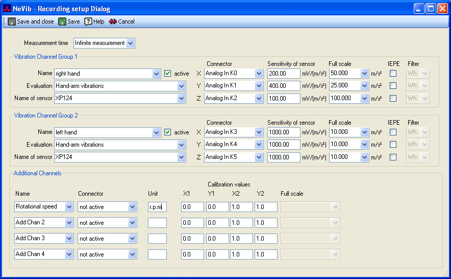 Please select a name for each additional channel which shall be active during the measurement. If the desired name is not contained in the list, you may enter a new name into the combobox (use the combobox like a textbox). After saving the recording setup the new name will be added to list of possible names. If you want to delete a name from this list you may do this in the Setup dialog.