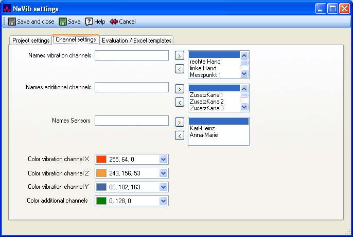 You may edit the list of possible names for the vibration channel groups. You may add new manes by entering them into the textbox and click the '>'-Button. The name will be added to the list. If you want to delete a name from the list, select it in the list and click the '<'-Button.