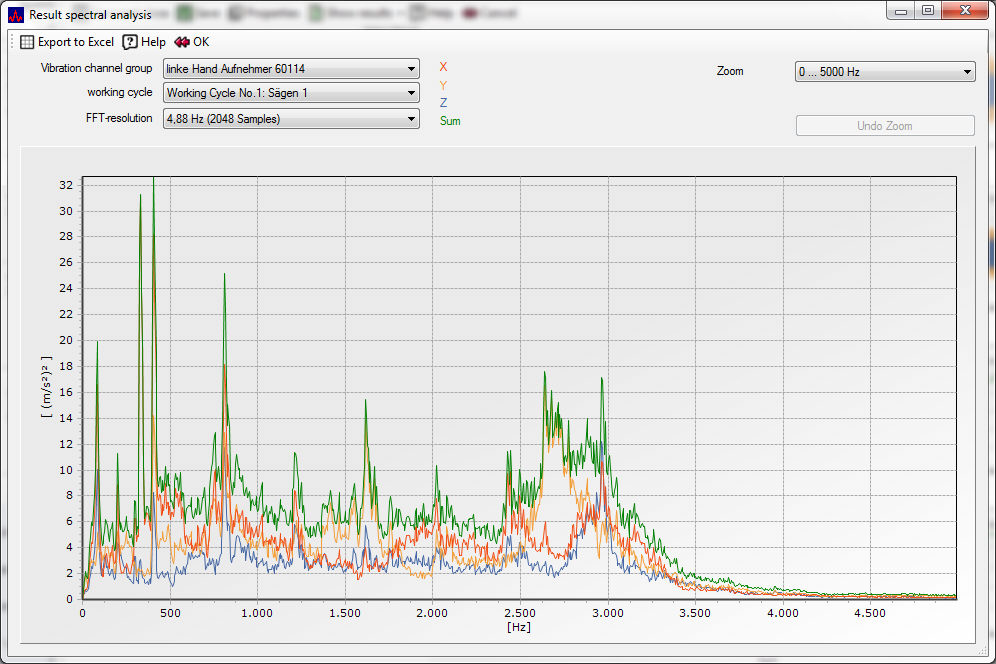 For each working cycle and each vibration measurement point (consisting of X- Y- Z-channel + sum) a spectral analysis may be performed.
