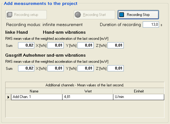 If 'Sum' is selected, for hand-arm-vibrations the vector sum (square root of x²+y²+z²) is displayed, for whole body vibrations the maximum of x, y and z is shown.