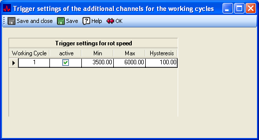 Trigger settings may be defined to filter some values for the vibrations from the whole measurement. These settings may be different or each working cycle. E.g. if the additional channel is the rotational speed, the trigger values may be different for idle state and for full load. The settings for working cycles which are not used are not displayed.