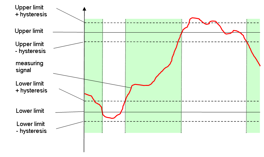 The diagram shows a signal with upper and lower limits. The ranges where the trigger conditions are fulfilled and where the vibration channels are evaluated are marked in green color. All other ranges will be ignored while calculating the evaluation.