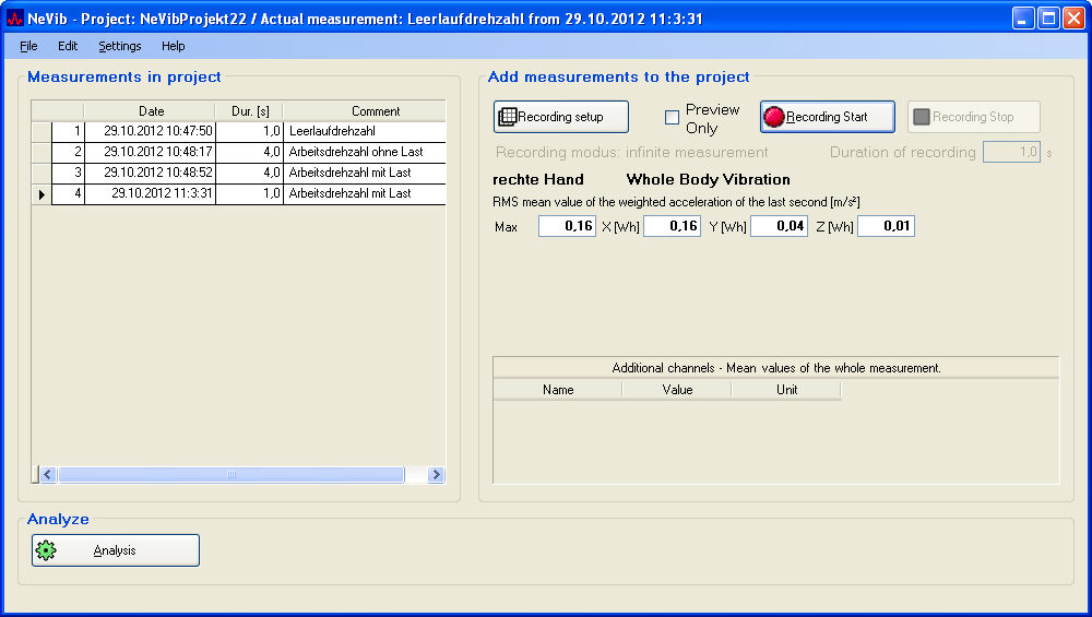With NeVib human exposure to mechanical vibrations may be measured, displayed and evaluated. According to EN ISO 8041 from 2004 the following evaluations are implemented: