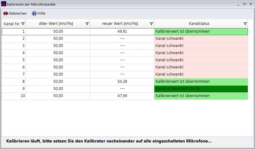 Wenn für alle eingeschalteten Mikrofone ein Kalibrierwert übernommen wurde, wird die Meldung